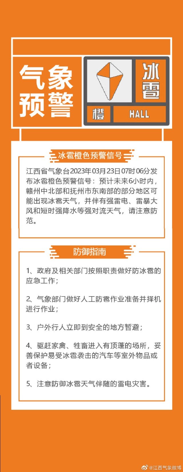 江西省氣象臺2023年03月23日07時06分發(fā)布冰雹橙色預警信號:預計未來6小時內(nèi),贛州中北部和撫州市東南部的部分地區(qū)可能出現(xiàn)冰雹天氣,并伴有強雷電、雷暴大風和短時強降水等強對流天氣,請注意防范。