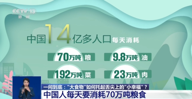 中國農業(yè)科學院研究員 國家食物與營養(yǎng)咨詢委員會主任 陳萌山:過去我們吃飯,主要是主糧,一大碗米飯或者一點咸菜,一點辣椒。那么現(xiàn)在不一樣了,我們一小碗米飯很多菜,不僅僅是主食,副食老百姓要求更高。我們講直接消費的口糧,已經由1978年的人均248公斤,下降到目前的130公斤,所以副食也成為主食了。為了適應這樣一個新的形勢,總書記提出“大食物觀”。