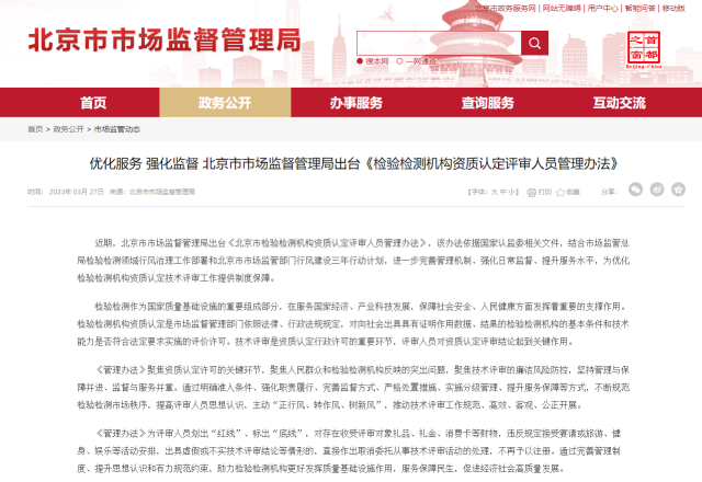 北京市市場監(jiān)督管理局出臺《檢驗檢測機構資質認定評審人員管理辦法》