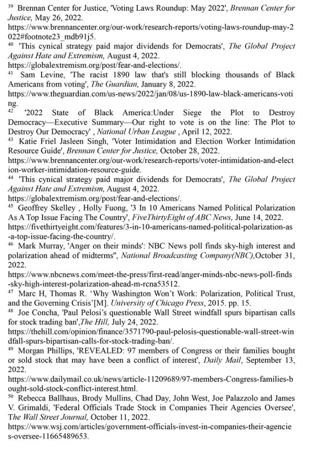 多重手法并用操弄選舉結(jié)果?!霸S多美國(guó)人完全摒棄了平等的觀念,而常常正是由這些摒棄平等觀念的人制定他人不得不遵守的規(guī)則。”(注38)限制選民投票資格的法律頻繁出臺(tái)。布倫南司法中心2022年5月26日發(fā)表的研究指出,2021年美國(guó)有18個(gè)州通過(guò)了34項(xiàng)限制投票的法律。在2022年的立法季,有39個(gè)州的立法機(jī)關(guān)審議了至少393項(xiàng)限制性法案,通過(guò)設(shè)置一系列投票障礙,極大地制約了有色人種選民行使投票權(quán)。亞利桑那州頒布了規(guī)制選民登記中提供身份證明文件的法律,多達(dá)20萬(wàn)名選民可能面臨被取消登記的風(fēng)險(xiǎn)。(注39)“全球反對(duì)仇恨和極端主義組織”2022年8月4日發(fā)表題為《美國(guó)人的恐懼感抑制民主參與》的報(bào)告指出,40%的非洲裔和37%的拉美裔美國(guó)人擔(dān)心被剝奪投票權(quán)利。(注40)英國(guó)《衛(wèi)報(bào)》網(wǎng)站2022年1月8日發(fā)表題為《1890年的種族主義法律仍在阻止成千上萬(wàn)的美國(guó)黑人投票》的文章指出,嚴(yán)苛的投票資格法律阻止了密西西比州近16%適齡投票的非洲裔美國(guó)人進(jìn)行投票。該州作為非洲裔最集中的地區(qū)之一,一個(gè)多世紀(jì)以來(lái)從未選舉出一名非洲裔擔(dān)任公職。(注41)“美國(guó)城市聯(lián)盟”2022年4月12日發(fā)布《2022年非洲裔美國(guó)人狀況報(bào)告:摧毀民主的陰謀籠罩之下》指出,過(guò)去一年,有20個(gè)州利用人口普查數(shù)據(jù)重新劃分選區(qū),剝奪了非洲裔等大量少數(shù)族裔選民的投票權(quán)。(注42)這些操縱選舉的手段變相剝奪了大量選民的投票資格,平等的選舉權(quán)名存實(shí)亡。