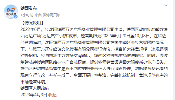 央視網(wǎng)消息:據(jù)@鐵西發(fā)布 微博4月3日消息,鐵西區(qū)人民政府發(fā)布情況說明。2022年6月,經(jīng)沈陽鐵西萬達廣場商業(yè)管理有限公司申請,鐵西區(qū)政府批準舉辦鐵西萬達廣場“萬達汽車小鎮(zhèn)”夜市,經(jīng)營期限為2022年6月20日至10月8日。在臨近經(jīng)營期滿時,沈陽鐵西萬達廣場商業(yè)管理有限公司在未申請延長經(jīng)營期限的情況下,與第三方遼寧峰瑞文化傳媒有限公司簽訂協(xié)議,擅自擴大經(jīng)營規(guī)模,違規(guī)超期對外招租。經(jīng)與市場主辦方多次溝通后,鐵西區(qū)對違規(guī)市場依法取締。同時,通過組建法律援助團隊維護業(yè)戶合法權(quán)益,提供多元經(jīng)營渠道最大限度減少業(yè)戶損失。