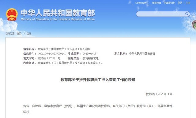 - 教育部發(fā)布《關(guān)于推開(kāi)教職員工準(zhǔn)入查詢工作的通知》