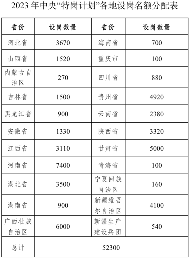 《通知》明確,2023年,中央“特崗計劃”仍面向中西部省份實施,重點向原“三區(qū)三州”、國家鄉(xiāng)村振興重點幫扶縣、少數(shù)民族地區(qū)等地區(qū)傾斜;重點為鄉(xiāng)村學校補充特崗教師,引導和鼓勵高校畢業(yè)生到鄉(xiāng)村學校任教;持續(xù)優(yōu)化教師隊伍結(jié)構,進一步加強道德與法治、體育與健康、外語、科學、勞動、藝術、信息科技、心理健康、特殊教育等緊缺薄弱學科教師的補充。