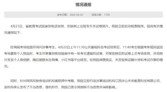 經調閱考場視頻并詢問涉事考生,4月22日上午11:30公共基礎科目考試結束后,11:40考生根據考務規(guī)則返回考場拿取個人物品時,考生鄧某看到前排抽屜中有一張考生遺留的試卷,鄧某拍照后把試卷上交考場老師,并將照片發(fā)至個人微信群,隨后被群友在微博、小紅書等平臺轉發(fā)。經江西省教育考試院調查核實,未發(fā)現有試題外泄和考試作弊的情況。