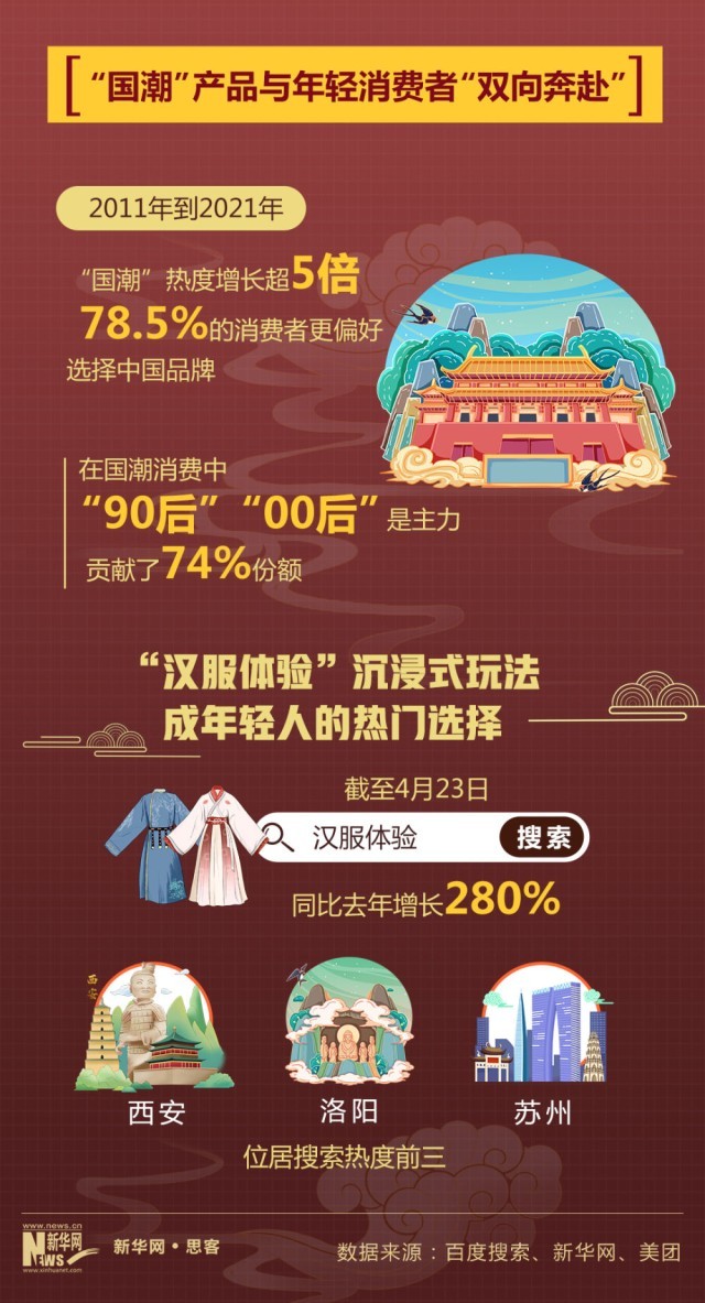 在眾多國潮消費項目中,融入故宮、敦煌、三星堆、山海經(jīng)、十二生肖等元素的諸多產(chǎn)品備受年輕人追捧,穿漢服、圍爐品茶等休閑選項也成為深受年輕人喜愛的中國式浪漫。