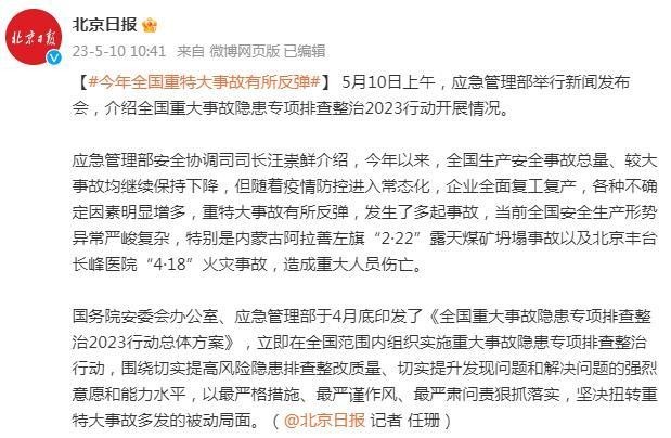應(yīng)急管理部:今年全國(guó)重特大事故有所反彈
