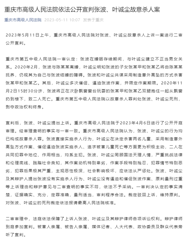 宣判后,張波、葉誠塵提出上訴。重慶市高級人民法院于2023年4月6日進行了公開開庭審理。經(jīng)審理查明的事實與一審一致。重慶市高級人民法院認為,張波、葉誠塵的行為均已構成故意殺人罪。張波直接實施殺人行為,葉誠塵在決定殺害兩名兒童、采用制造意外高墜方式作案、催促逼迫張波實施殺人、追求被害兒童死亡等方面更為積極主動,二人在共同犯罪中地位、作用相當,均系主犯。張波、葉誠塵罔顧國法天理人情,嚴重挑戰(zhàn)法律和倫理底線、踐踏社會良知,其作案動機特別卑劣,作案手段特別殘忍,犯罪情節(jié)特別惡劣,犯罪后果極其嚴重,主觀惡性極深,社會影響極壞,應依法從嚴懲處。張波、葉誠塵及其辯護人提出張波沒有實施殺人行為、葉誠塵沒有逼迫和催促張波作案、原判量刑過重等上訴理由和辯護意見與二審查明的事實不符,依法不予采納。一審判決認定的事實清楚,證據(jù)確實、充分,定罪準確,量刑適當,審判程序合法。裁定駁回上訴,維持原判。對張波、葉誠塵的死刑裁定依法報請最高人民法院核準。