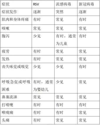 針對年初到現(xiàn)在流行的新冠病毒、甲型流感病毒和呼吸道合胞病毒,唐蘭芳解釋說,這三種病毒都是通過呼吸道傳播、且傳染性強的病毒,均會引起發(fā)熱、咳嗽及鼻塞流涕等癥狀,因此有時很難區(qū)分感染了哪種病毒,雖然這些病毒有不少相似的癥狀,但也有一些區(qū)別,如流感病毒感染潛伏期短,通常是突然發(fā)熱,高熱為主,而另外兩種則是逐漸發(fā)病,且呼吸道合胞病毒感染的患兒中腹瀉較為少見,可以參考表格內容,明確診斷的話建議行相關核酸或抗原檢測。
