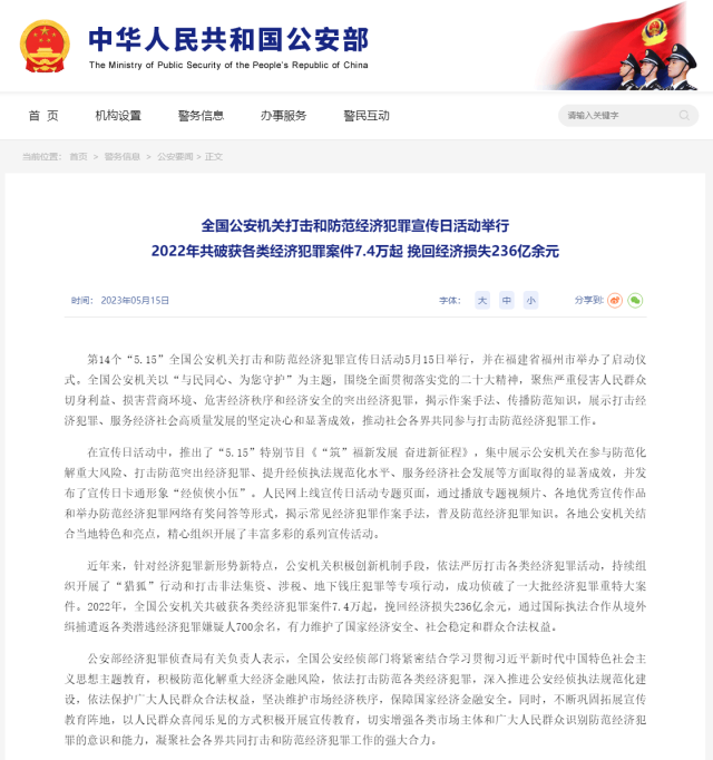 公安部:2022年共破獲各類經(jīng)濟(jì)犯罪案件7.4萬(wàn)起