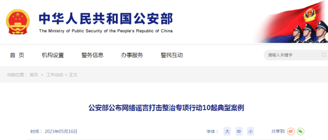 公安部今日公布打擊整治網絡謠言10起典型案例: