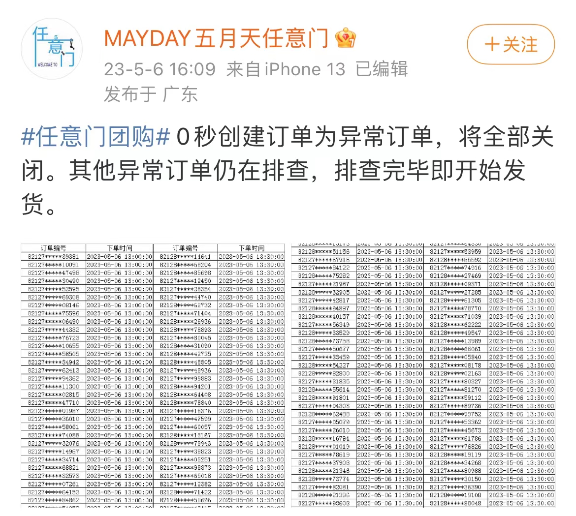 5月6日晚,五月天粉絲團(tuán)票的最后一日,“MAYDAY五月天任意門(mén)”粉絲站在社交媒體公布大量0秒異常訂單,并表示異常訂單將全部關(guān)閉,排查完畢后即開(kāi)始發(fā)貨。然而不足3個(gè)小時(shí),一則團(tuán)票取消的通知讓粉絲們剛剛搶到票的喜悅消失殆盡。