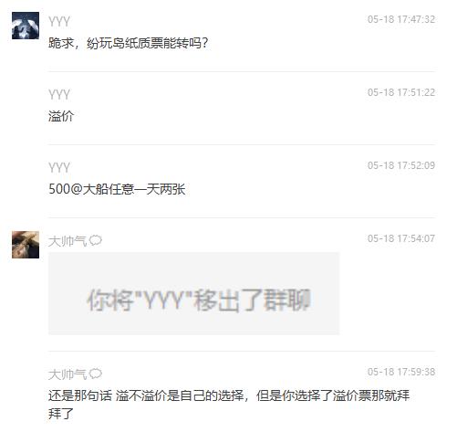 下一秒,群主現(xiàn)身并放出一張截圖,上面顯示求票的粉絲已被移除群聊。隨后群主寫(xiě)道:“還是那句話,溢不溢價(jià)是自己的選擇,但是你選擇了溢價(jià)票那就拜拜了。”
