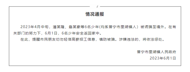 央視網(wǎng)消息:據(jù)“普寧發(fā)布”微信公眾號消息,普寧市里湖鎮(zhèn)人民政府情況發(fā)布通報稱,2023年4月中旬,潘某隆、詹某豪等6名少年(均系普寧市里湖鎮(zhèn)人)被誘騙至境外。在有關部門的努力下,6月1日,6名少年安全返回家中。