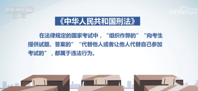 《中華人民共和國刑法》規(guī)定,在法律規(guī)定的國家考試中“組織作弊的”“向考生提供試題、答案的”“代替他人或者讓他人代替自己參加考試的”,都屬于違法行為?!蹲罡呷嗣穹ㄔ骸⒆罡呷嗣駲z察院關(guān)于辦理組織考試作弊等刑事案件適用法律若干問題的解釋》明確,對在高考等國家教育考試中組織作弊的,將直接認定為“情節(jié)嚴重”行為,處三年以上七年以下有期徒刑并處罰金。