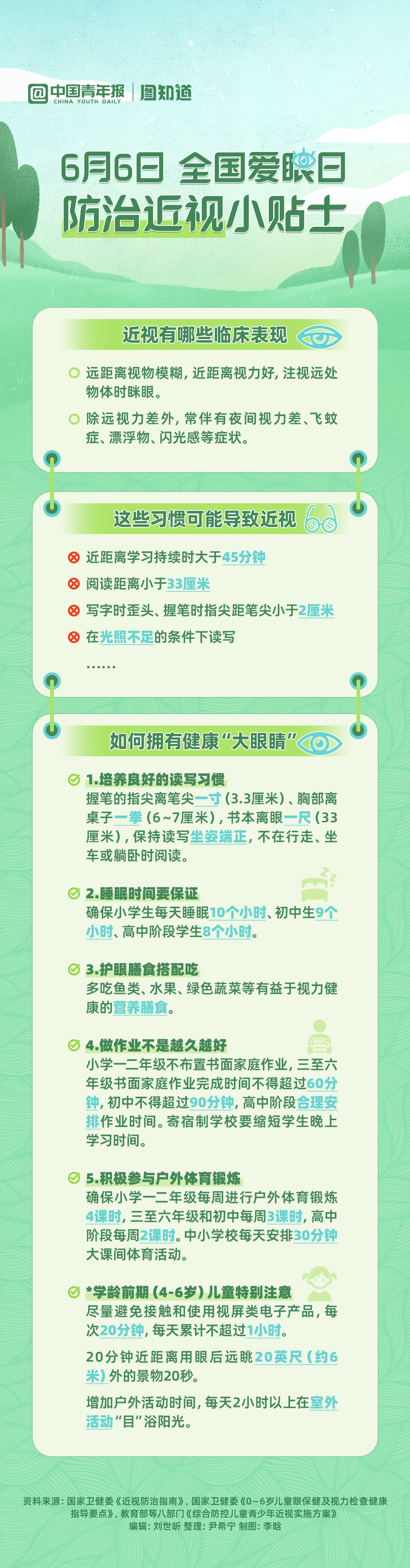 今年6月6日是第28個全國愛眼日。國家衛(wèi)健委數(shù)據(jù)顯示,2022年全國兒童青少年總體近視率為53.6%。你知道這些防治近視的小知識嗎:讀寫做到“一寸一拳一尺”;確保小學生每天睡眠10個小時;中小學校每天安排30分鐘大課間體育活動……轉(zhuǎn)給身邊的青少年朋友,一起守護健康“大眼睛”。