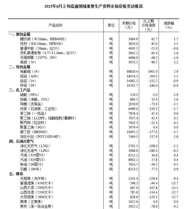 2023年6月上旬流通領域重要生產資料市場價格變動情況