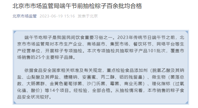 北京市市場(chǎng)監(jiān)管局:端午節(jié)前抽檢粽子百余批均合格