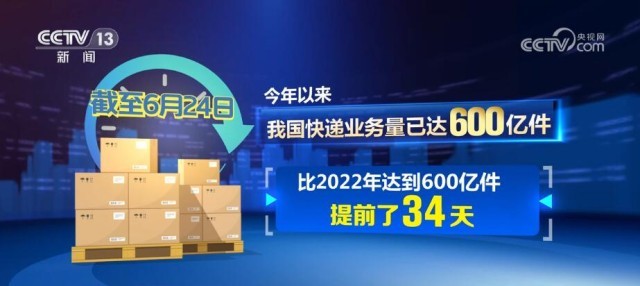 國(guó)家郵政局?jǐn)?shù)據(jù)顯示,截至6月24日,今年以來(lái)我國(guó)快遞業(yè)務(wù)量已達(dá)600億件,比2022年達(dá)到600億件提前了34天。
