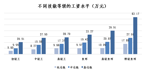 從工資中位數(shù)看,首席技師工資超初級工3倍。首席技師、特級技師、高級技師、技師、高級工、中級工和初級工分別為30.33萬元、27.91萬元、20.87萬元、19.43萬元、17.37萬元、15.58萬元和9.95萬元。