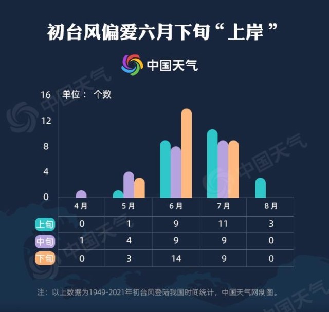 根據(jù)預(yù)報,這個熱帶系統(tǒng)或?qū)⒂?月17日至18日左右在廣東到海南一帶沿海登陸。據(jù)中國天氣網(wǎng)大數(shù)據(jù)顯示,一般首個登陸我國的臺風(fēng)多集中在每年的6月至7月,其中,6月下旬登陸的比例最高,7月上旬登陸比例位列第二。