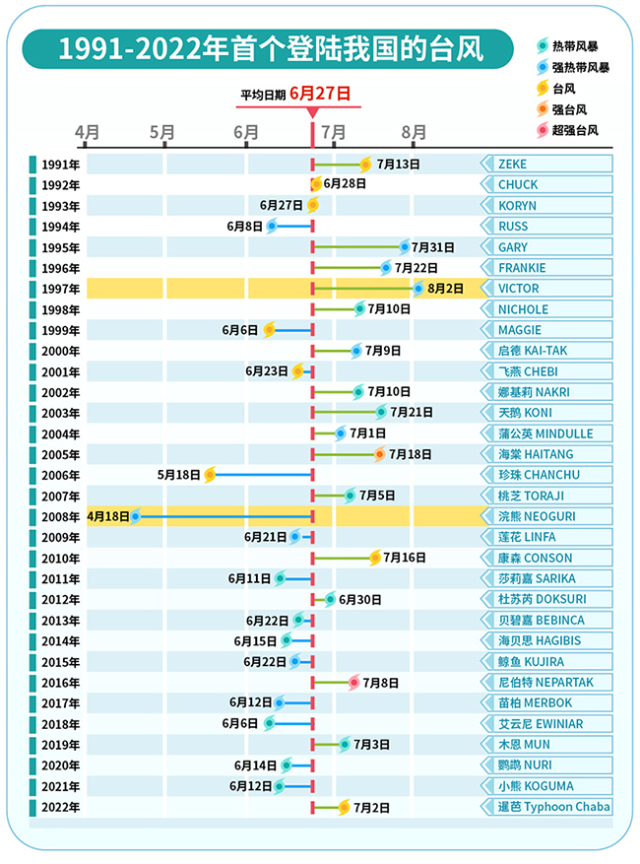 1991-2022年首個登陸我國的臺風名稱、登陸日期及登陸時強度 丁茜制圖