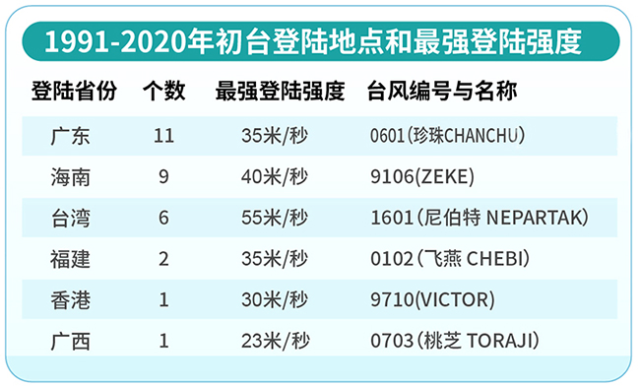 1991-2020年初臺登陸地點和最強登陸強度 丁茜制圖