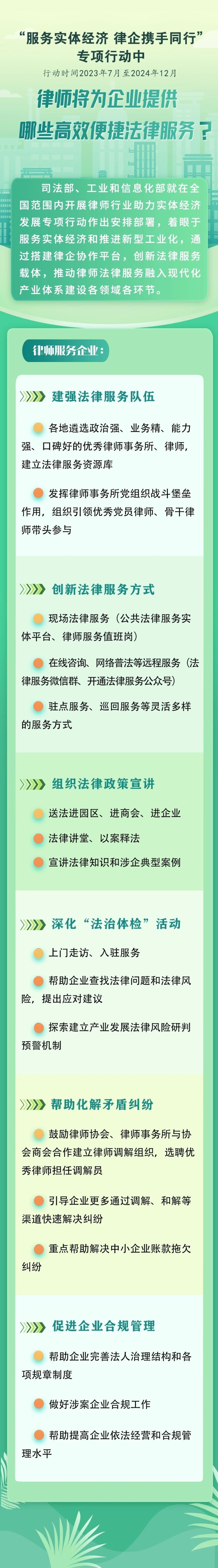 《方案》要求,各地司法行政部門、工業(yè)和信息化主管部門、通信管理局和律師協(xié)會要共同組織優(yōu)秀律師事務(wù)所和律師,為工業(yè)和信息化領(lǐng)域相關(guān)企業(yè)提供全業(yè)務(wù)、全時(shí)空、高效便捷的法律服務(wù)?;顒又校甯黝惼髽I(yè)法律服務(wù)需求,建強(qiáng)法律服務(wù)隊(duì)伍,創(chuàng)新法律服務(wù)方式,通過開展法律政策宣講、深化“法治體檢”活動等形式,推動律師行業(yè)服務(wù)實(shí)體經(jīng)濟(jì)的廣度和深度不斷拓展,服務(wù)的專業(yè)性、精準(zhǔn)性、便捷性、實(shí)效性不斷增強(qiáng),幫助企業(yè)化解法律風(fēng)險(xiǎn),解決法律問題,維護(hù)合法權(quán)益,提升依法合規(guī)經(jīng)營管理水平。