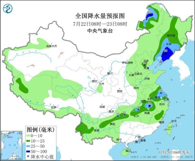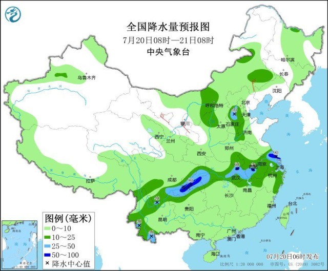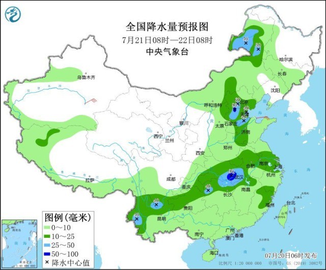 圖1 全國降水量預報圖(7月20日08時-21日08時)
