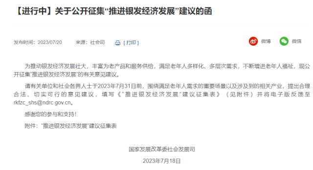 國(guó)家發(fā)改委:現(xiàn)公開(kāi)征集“推進(jìn)銀發(fā)經(jīng)濟(jì)發(fā)展”的有關(guān)意見(jiàn)建議