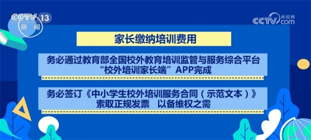 家長(zhǎng)繳納培訓(xùn)費(fèi)用,務(wù)必通過(guò)教育部全國(guó)校外教育培訓(xùn)監(jiān)管與服務(wù)綜合平臺(tái)“校外培訓(xùn)家長(zhǎng)端”APP完成;務(wù)必簽訂《中小學(xué)生校外培訓(xùn)服務(wù)合同(示范文本)》,索取正規(guī)發(fā)票,以備維權(quán)之需;務(wù)必控制額度,一次性繳費(fèi)不要超過(guò)3個(gè)月或60課時(shí),且不要超過(guò)5000元,切勿受“充值贈(zèng)送”等方式誘惑,繳納高額培訓(xùn)費(fèi)。