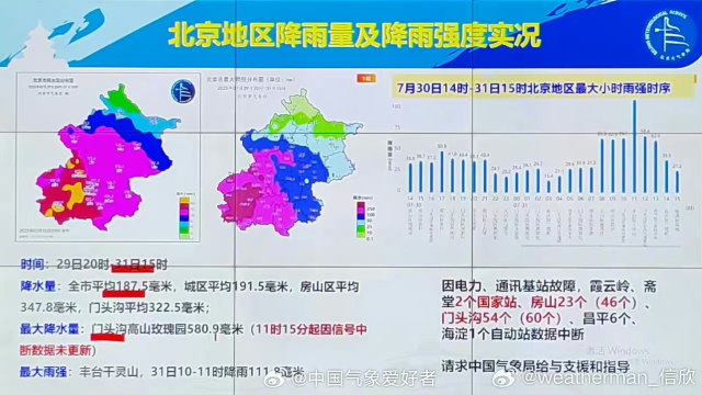 微博賬號(hào)“中國(guó)氣象愛好者”發(fā)布消息稱,北京西部大量氣象站因特大暴雨導(dǎo)致電力通信和設(shè)備故障失聯(lián) 來(lái)源:微博