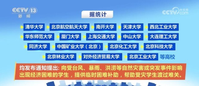 據(jù)統(tǒng)計(jì),清華大學(xué)、北京航空航天大學(xué)、南開大學(xué)、天津大學(xué)、西北工業(yè)大學(xué)、華東師范大學(xué)、廈門大學(xué)、上海交通大學(xué)、中山大學(xué)、大連理工大學(xué)、同濟(jì)大學(xué)、中國礦業(yè)大學(xué)(北京)、北京化工大學(xué)、北京科技大學(xué)、北京林業(yè)大學(xué)、對外經(jīng)濟(jì)貿(mào)易大學(xué)、北京工業(yè)大學(xué)等高校均發(fā)布通知提出,向受臺風(fēng)、暴雨、洪澇等自然災(zāi)害或突發(fā)事件影響出現(xiàn)經(jīng)濟(jì)困難的學(xué)生,提供臨時困難補(bǔ)助,幫助受災(zāi)學(xué)生渡過難關(guān)。