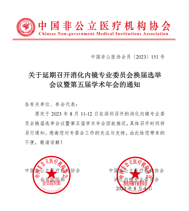 消化內鏡專業(yè)委員會換屆選舉會議暨第五屆學術年會延期通知。圖片來源:中國非公立醫(yī)療機構協(xié)會