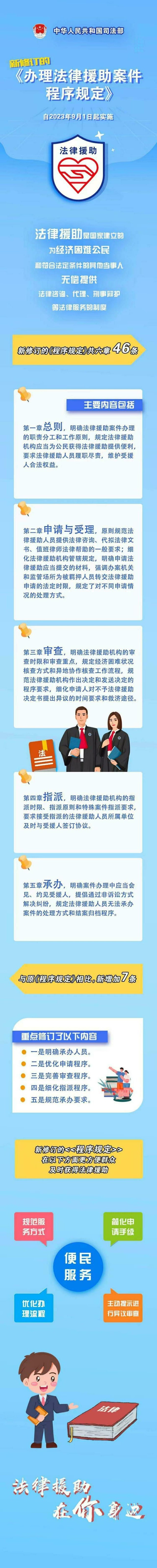 為貫徹落實(shí)法律援助法,提高法律援助案件辦理程序的標(biāo)準(zhǔn)化規(guī)范化水平,司法部對(duì)2012年公布并施行的《辦理法律援助案件程序規(guī)定》進(jìn)行了全面修訂,修訂后的《程序規(guī)定》,在方便群眾及時(shí)獲得法律援助、提高法律援助服務(wù)質(zhì)量等方面,作出了一系列具體規(guī)定?!冻绦蛞?guī)定》自2023年9月1日起施行。