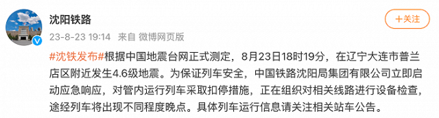 央視網消息:據(jù)@沈陽鐵路 微博消息,根據(jù)中國地震臺網正式測定,8月23日18時19分,在遼寧大連市普蘭店區(qū)附近發(fā)生4.6級地震。為保證列車安全,中國鐵路沈陽局集團有限公司立即啟動應急響應,對管內運行列車采取扣停措施,正在組織對相關線路進行設備檢查,途經列車將出現(xiàn)不同程度晚點。具體列車運行信息請關注相關站車公告。