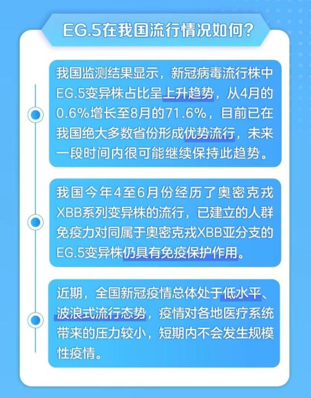 部分公眾關(guān)心EG.5是否會引發(fā)新一輪的廣泛流行。對此,國家疾控局表示,我國今年4至6月份經(jīng)歷了奧密克戎XBB系列變異株的流行,已建立的人群免疫力對同屬于奧密克戎XBB亞分支的EG.5變異株仍具有免疫保護(hù)作用,短期內(nèi)不會發(fā)生規(guī)模性疫情。