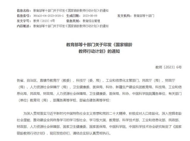 央視網(wǎng)消息:據(jù)教育部,為深入貫徹落實習(xí)近平新時代中國特色社會主義思想和黨的二十大精神,積極應(yīng)對人口老齡化,深入挖掘老齡社會潛能,推動建設(shè)全民終身學(xué)習(xí)的學(xué)習(xí)型社會、學(xué)習(xí)型大國,教育部、科學(xué)技術(shù)部、工業(yè)和信息化部、民政部、財政部、人力資源社會保障部、國家衛(wèi)生健康委、國家醫(yī)保局、中國科學(xué)院、中國科學(xué)技術(shù)協(xié)會研究制定了《國家銀齡教師行動計劃》,現(xiàn)印發(fā)給你們,請結(jié)合實際認真貫徹執(zhí)行。