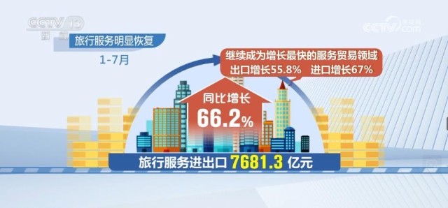 旅行服務(wù)明顯恢復(fù)。1月—7月,旅行服務(wù)進(jìn)出口7681.3億元,同比增長(zhǎng)66.2%,繼續(xù)成為增長(zhǎng)最快的服務(wù)貿(mào)易領(lǐng)域。其中,出口增長(zhǎng)55.8%、進(jìn)口增長(zhǎng)67%。