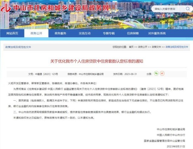中新網(wǎng)8月31日電 據(jù)廣東省中山市住房和城鄉(xiāng)建設(shè)局網(wǎng)站消息,31日,中山市住房和城鄉(xiāng)建設(shè)局、中國人民銀行中山市分行、國家金融監(jiān)督管理總局中山監(jiān)管分局等三部門聯(lián)合發(fā)布《關(guān)于優(yōu)化我市個人住房貸款中住房套數(shù)認定標準的通知》。通知提出,居民家庭(包括借款人、配偶及未成年子女,下同)申請貸款購買商品住房時,家庭成員在當?shù)孛聼o成套住房的,不論是否已利用貸款購買過住房,銀行業(yè)金融機構(gòu)均按首套住房執(zhí)行住房信貸政策。