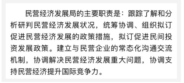 今天(9月4日)有個消息刷了屏:國家發(fā)改委新設民營經(jīng)濟發(fā)展局。仔細閱讀官方通稿,民營經(jīng)濟發(fā)展局主要職責103字,沒提一個“管”字。點擊視頻↓↓↓