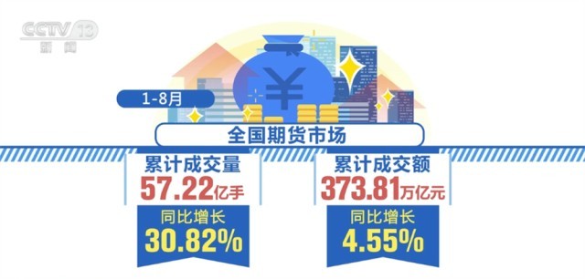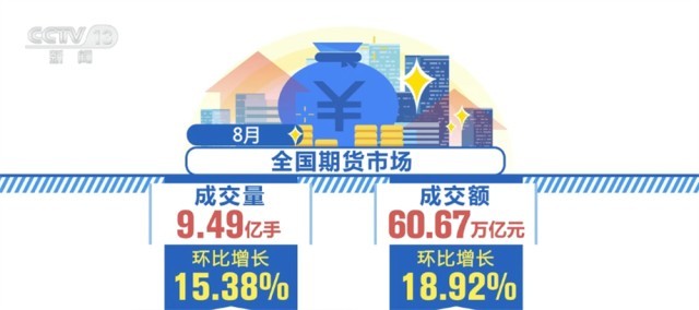 中國期貨業(yè)協會數據顯示,8月全國期貨市場成交量為9.49億手,成交額為60.67萬億元,同比分別增長47.76%和23.49%,環(huán)比分別增長15.38%和18.92%。