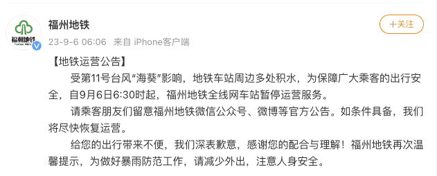 央視網(wǎng)消息:據(jù)@福州地鐵 微博消息,受第11號臺風(fēng)“??庇绊懀罔F車站周邊多處積水,為保障廣大乘客的出行安全,自9月6日6:30時起,福州地鐵全線網(wǎng)車站暫停運營服務(wù)。如條件具備,將盡快恢復(fù)運營。