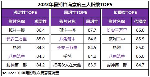 中國電影觀眾滿意度調(diào)查 2023年暑期檔調(diào)查結(jié)果顯示,暑期檔電影觀眾滿意度得分84.5分,較“五一”檔增長1.2分。檔期豐富多元的影片內(nèi)容得到了觀眾的高滿意度評價,調(diào)查的13部影片悉數(shù)進入“滿意”區(qū)間(≥80分),有6部影片滿意度超84分,數(shù)量及占比居歷年同期之最。其中《孤注一擲》《長安三萬里》分別以86.4分、85.1分為檔期滿意度單片冠亞軍,《八角籠中》《茶啊二中》《熱烈》和《封神第一部》四部影片滿意度均超84分。2023年暑期檔高滿意度佳作迭出,市場驚喜不斷,觀影氛圍持續(xù)火熱。