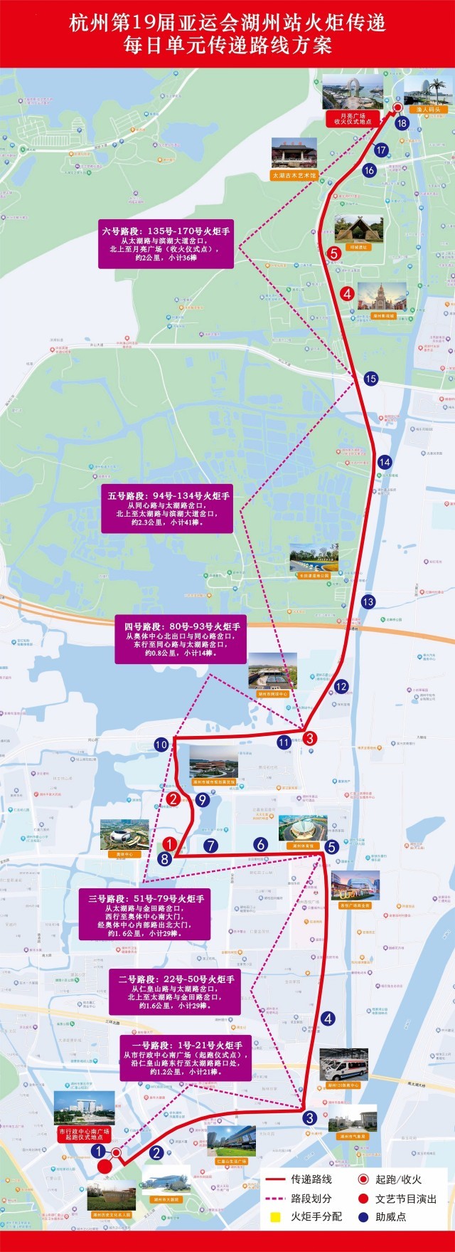 本次傳遞以“在湖州看見美麗中國”為主題,傳遞路線從湖州市行政中心南廣場(chǎng)出發(fā),沿仁皇山路—太湖路—金田路—奧體中心—同心路—太湖路進(jìn)行傳遞,最后到達(dá)南太湖月亮廣場(chǎng),舉行收火儀式。