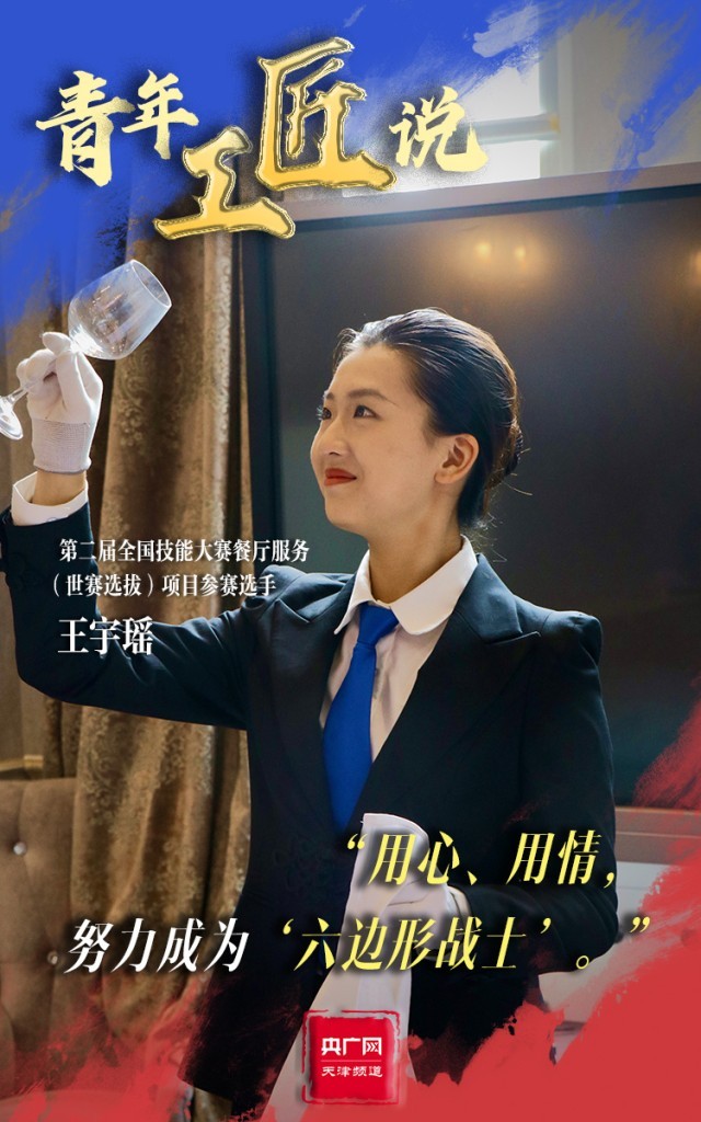 370余個考核點(diǎn),對于第二屆全國技能大賽餐廳服務(wù)(世賽選拔)項(xiàng)目參賽選手王宇瑤來說,有著巨大的考驗(yàn)。但面對困難,王宇瑤始終保持微笑,在老師的指導(dǎo)下練習(xí)調(diào)制雞尾酒、餐巾折花、餐桌擺盤成百上千次。整齊的著裝、得體大方的儀容、神采奕奕的狀態(tài),一顰一笑皆為王宇瑤的細(xì)心巧思?!拔覍⒁源舜伪荣悶槠鯔C(jī),努力磨煉技藝,成為一名全面發(fā)展的‘六邊形戰(zhàn)士’?!蓖跤瞵幮χf道。