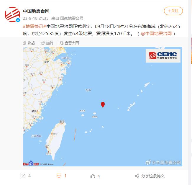 中國(guó)地震臺(tái)網(wǎng)正式測(cè)定:09月18日21時(shí)21分在東海海域(北緯26.45度,東經(jīng)125.35度)發(fā)生6.4級(jí)地震,震源深度170千米。