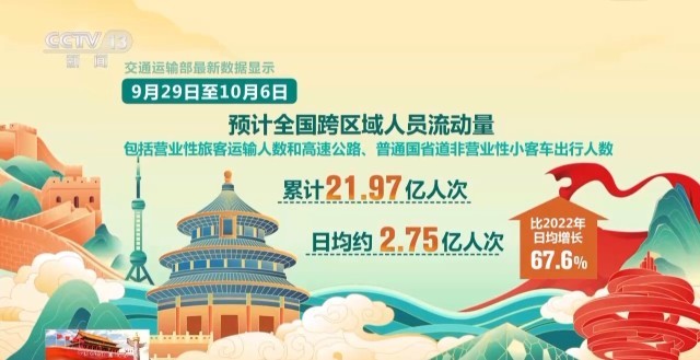 交通運輸部最新數(shù)據(jù)顯示,9月29日至10月6日預計全國跨區(qū)域人員流動量(包括營業(yè)性旅客運輸人數(shù)和高速公路、普通國省道非營業(yè)性小客車出行人數(shù))累計21.97億人次,日均約2.75億人次,比2022年日均增長67.6%。