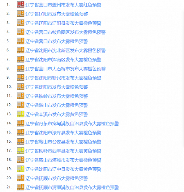 央視網(wǎng)消息:據(jù)“遼寧發(fā)布”微信公眾號消息,10月10日早晨,遼沈大地被大霧籠罩。截至目前,除遼西地區(qū)外,遼寧省內(nèi)大部分地區(qū)已陸續(xù)發(fā)布大霧橙色預(yù)警,其中營口蓋州已發(fā)布大霧紅色預(yù)警,最低能見度已低至50米以下。