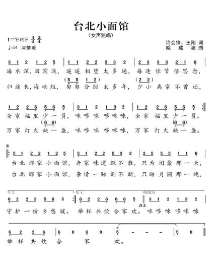 歌曲《臺北小面館》圍繞中華民族唇齒相依、骨肉相連一家親,海峽兩岸一脈相承、血濃于水一家人的熾熱情感為主線,歌詞通過“海水深,淚窩淺”“歸途長,海峽短”,抒發(fā)了同胞隔海相望的濃濃思念之情,以及“每逢佳節(jié)倍思念”“少小離家不曾還”,傾訴著親人渴望團(tuán)圓的深深相思。