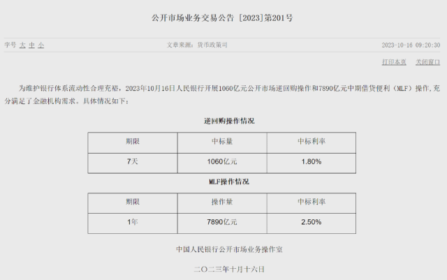 為維護銀行體系流動性合理充裕,10月16日中國人民銀行開展1060億元公開市場逆回購操作和7890億元中期借貸便利(MLF)操作,充分滿足了金融機構(gòu)需求。